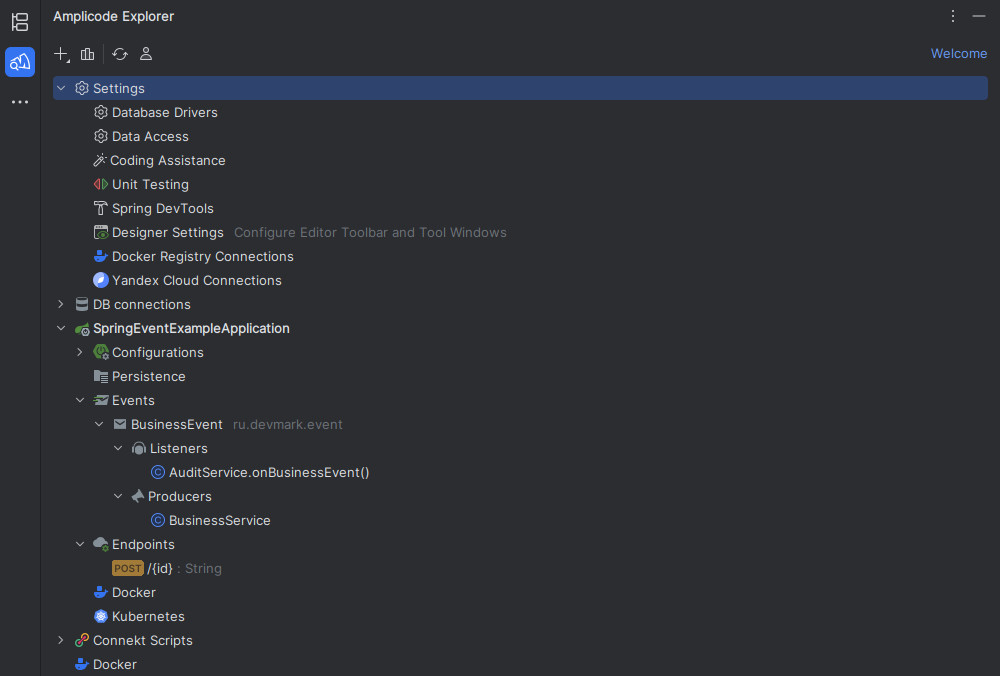 Среди прочих полезных вещей в этом плагине хочу упомянуть удобную навигацию по Spring-бинам. Также доступно отдельное окно Amplicode Explorer, где будут сгруппированы все абстракции, специфичные для Spring (эндпоинты, события, конфигурации, источники данных и даже роли Spring Security).
