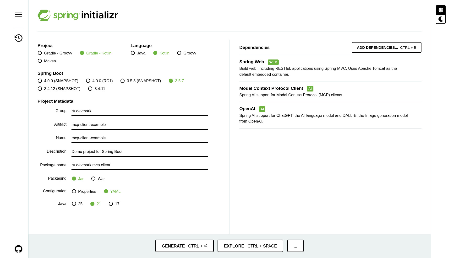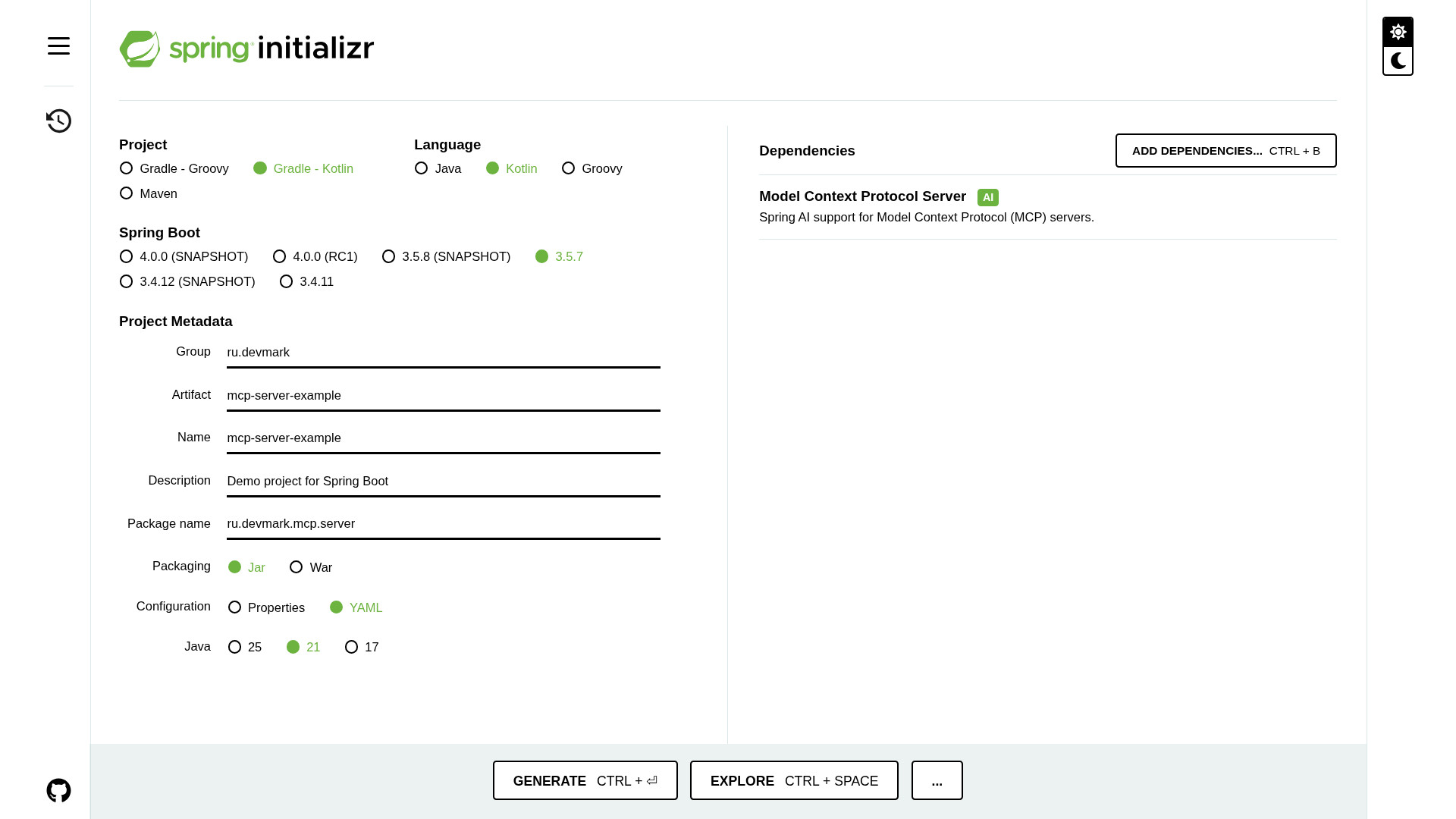 Создадим заготовку mcp-сервера с помощью Spring Initializr. Выбираем тип проекта - Gradle-Kotlin, язык - Kotlin, версия Java - 21, формат конфигурации - YAML. Из зависимостей нам понадобится только Model Context Protocol Server.