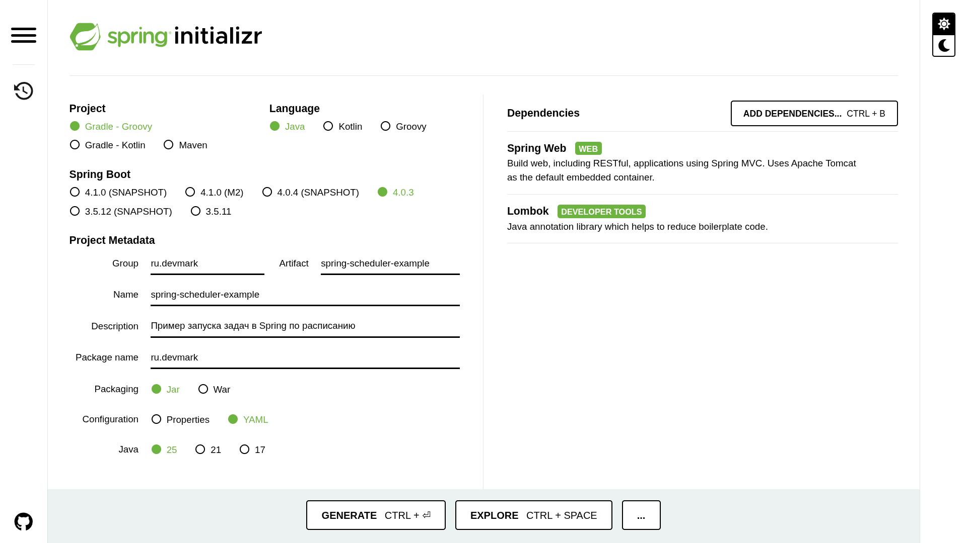 В качестве примера давайте создадим простой проект с помощью Spring Initializr. Мы выберем в качестве языка Java 25, в качестве сборщика - Gradle, Spring последней стабильной версии и конфигурацию в формате yaml. В зависимости проекта добавим Spring Web, который содержит функционал шедулинга. Также добавим Lombok, чтобы меньше писать шаблонного кода.